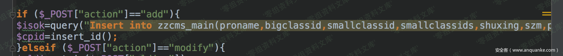 首先找到表名,是zzcms_main表,然后找一下insert或者update操作,然后我们在/user/zssave.php中发现了有关操作。