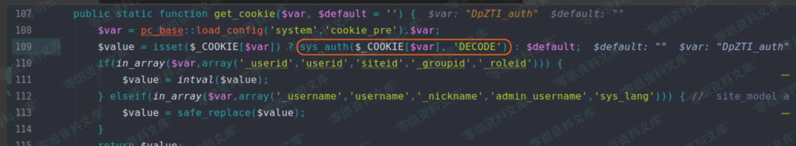 我们先来看一下待解密数据 $phpcms_auth 如何构造。从下图中,可以看出程序将从 cookie 中的 xxx_auth 字段经过 sys_auth 函数解密后,返回给了 $phpcms_auth ,而默认情况下使用 pc_base::load_config(‘system’, ‘auth_key’) 作为加解密的 key 值。