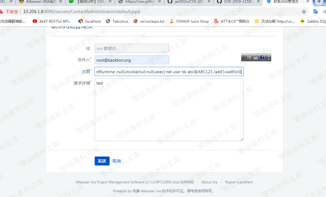 第二种利用场景前提是拿到Jira管理员的权限,利用条件较难满足,这里主要分析第一种情况。原因在于`atlassian-jira/WEB-INF/classes/com/atlassian/jira/web/action/user/ContactAdministrators` 未对Subject(邮件主题)处进行过滤,用户传入的邮件主题被当作template(模板)指令执行。在任何一种情况下,成功利用此漏洞的攻击者都可在运行受影响版本的Jira Server或Jira Data Center的系统上执行任意命令。