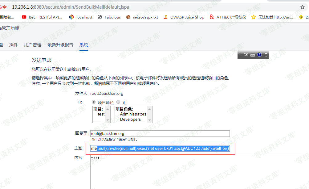 在Subject填入payload,注意,我这里环境是windows机器,所以可以添加账号观察,Linux可以用反弹shell的代码等等,反正换成自己想执行的命令。