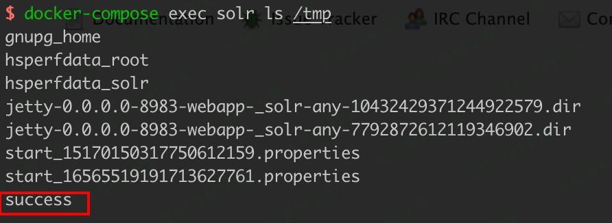 执行`docker-compose exec solr ls /tmp`,可见`/tmp/success`已成功创建: