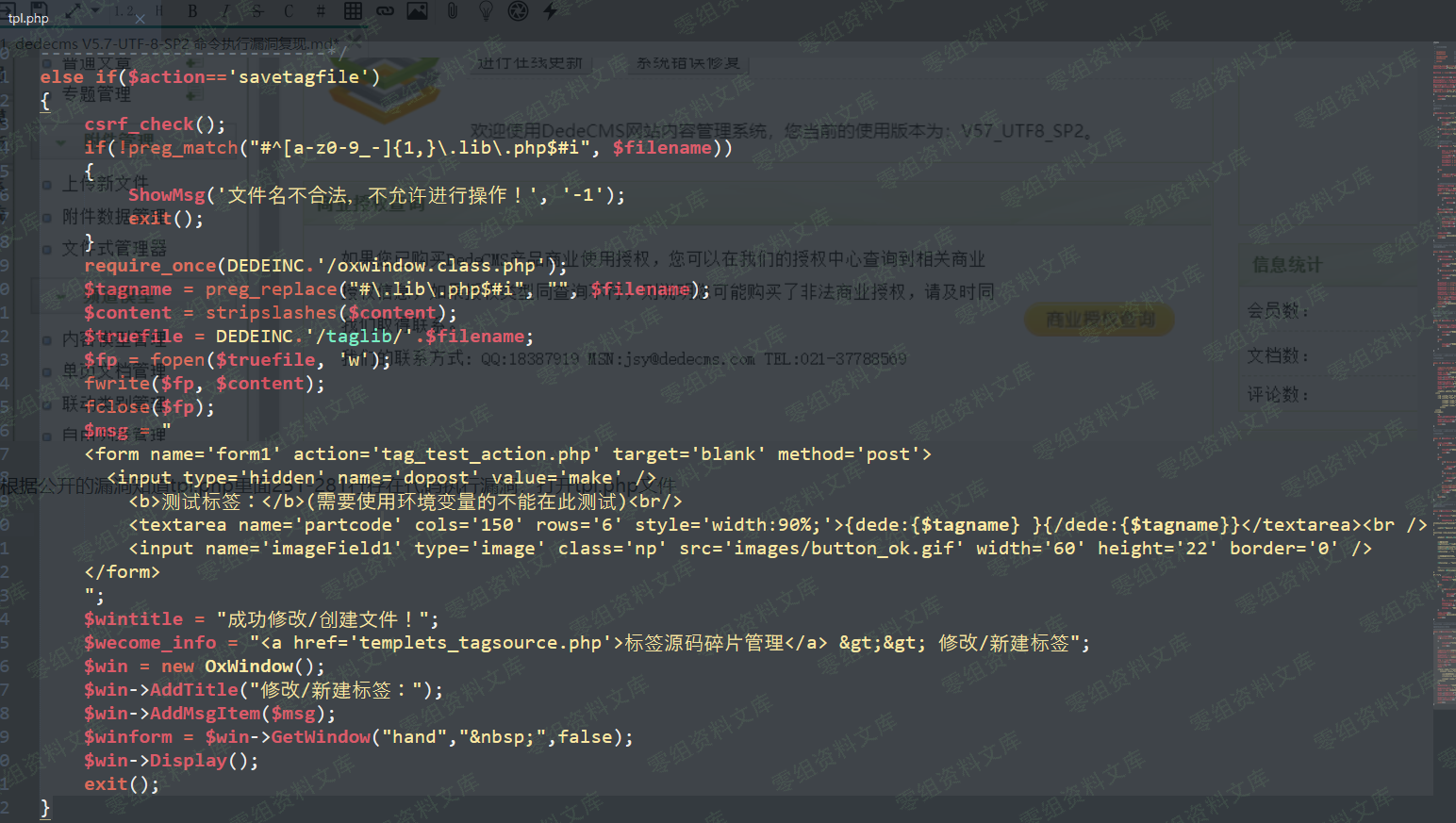 根据公开的漏洞知道tpl.php里面251-281行存在代码执行漏洞,打开tpl.php文件