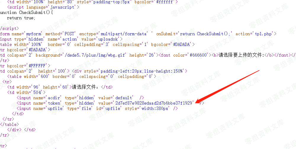 根据上面的代码知道要上传的参数有:`action,token,filename,content`.现在只剩下获取token了,要怎么才能获取到token呢?我们再去tpl.php里看一下,发现action的参数有很多,比如`del,upoladok,edit,upload`等等,但只有传入upload的时候页面才会回显正常,而其他的都会显示token异常,所以只能通过`action=upload`来获取token。