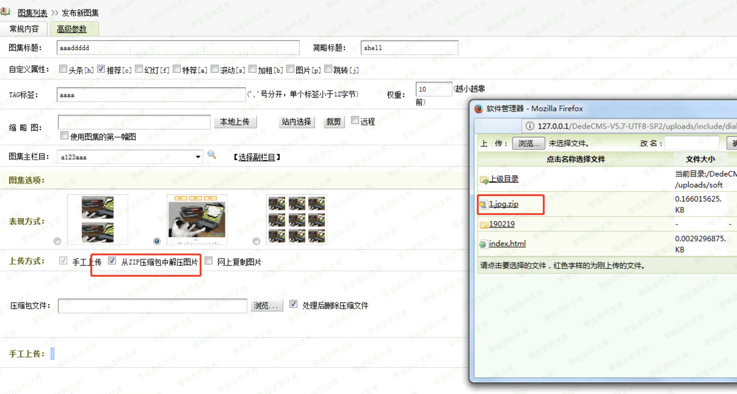 4、访问`dede/album_add.php`,选择从 从ZIP压缩包中解压图片