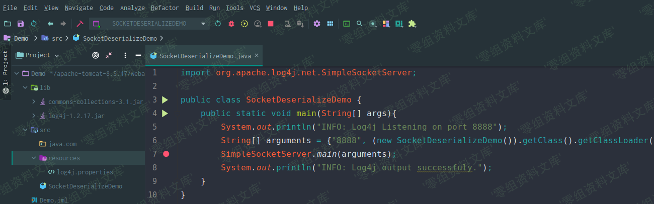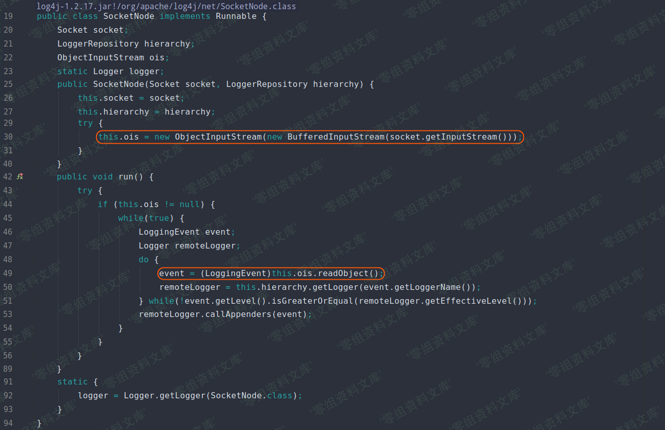 Apache Log4j <= 1.2.17 Apache Log4j的1.X版本官方在2015年8月已停止维护 ### 复现过程 **漏洞分析** 其实这个漏洞非常简单,本质就是对从 socket 流中获取的数据没有进行过滤,而直接反序列化。如果当前环境中存在可利用的反序列化 Gadget 链,就可以达到命令执行等效果。我们可以创建如下 Demo 代码用于测试。  ```java // src/SocketDeserializeDemo.java import org.apache.log4j.net.SimpleSocketServer; public class SocketDeserializeDemo { public static void main(String[] args){ System.out.println("INFO: Log4j Listening on port 8888"); String[] arguments = {"8888", (new SocketDeserializeDemo()).getClass().getClassLoader().getResource("log4j.properties").getPath()}; SimpleSocketServer.main(arguments); System.out.println("INFO: Log4j output successfuly."); } } ``` ```bash # src/resources/log4j.properties log4j.rootCategory=DEBUG,stdout log4j.appender.stdout=org.apache.log4j.ConsoleAppender log4j.appender.stdout.layout=org.apache.log4j.PatternLayout log4j.appender.stdout.threshold=DEBUG log4j.appender.stdout.layout.ConversionPattern=[%d{yyy-MM-dd ヾノ≧∀≦)O:mm:ss,SSS}]-[%p]-[MSG!:%m]-[%c\:%L]%n ``` 我们跟进 SimpleSocketServer 的 main 方法,发现其中调用了 SocketNode 类,具体代码如下。  如下图, SocketNode 类实现了 Runnable 接口,其构造方法从 socket 流中获取了数据,并将数据封装为一个 ObjectInputStream 对象。然后在其 run 方法中调用了 readObject 方法进行反序列化操作。由于这里没有对数据进行过滤,所以这里就出现了反序列化漏洞。  这里我们添加一条 commons-collections 的 Gadget 链用来演示命令执行。