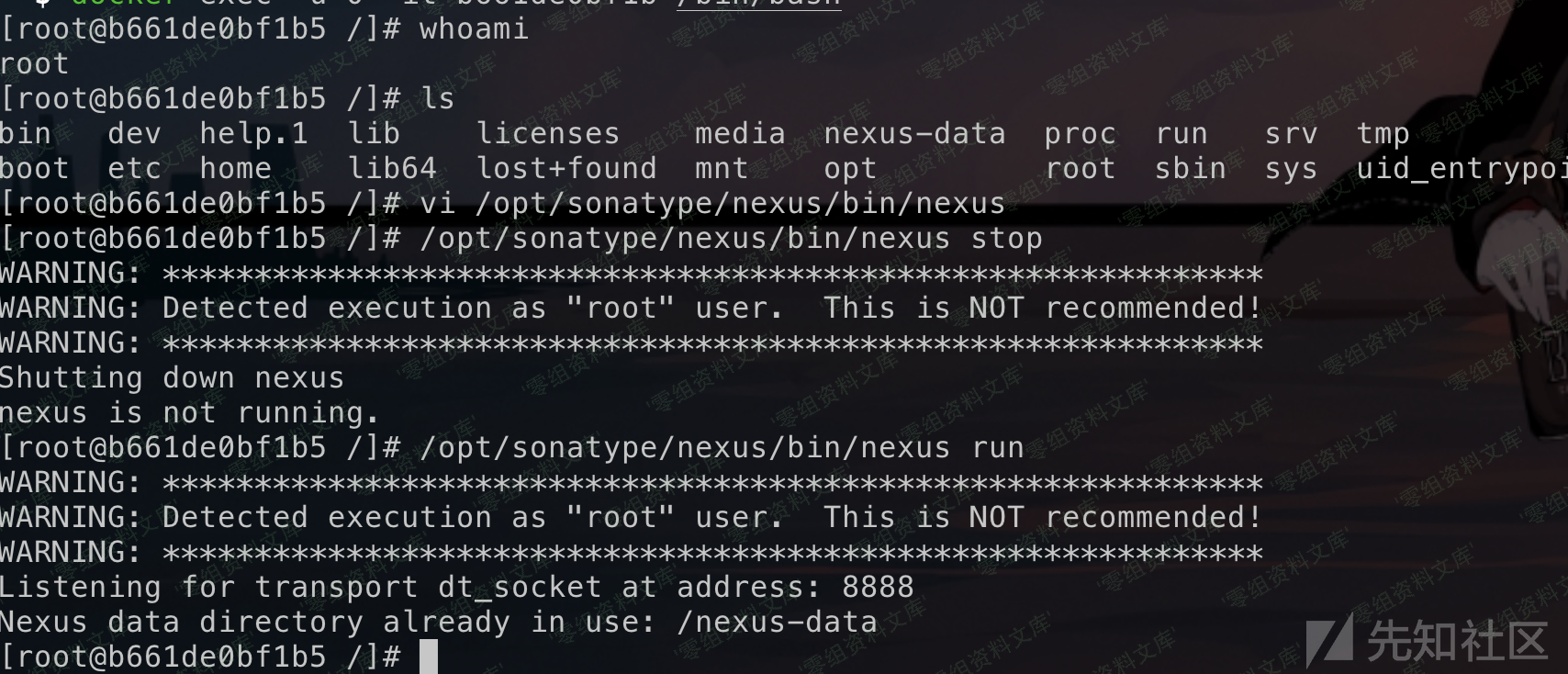 然后切成root用户进入容器修改启动项/opt/sonatype/nexus/bin/nexus