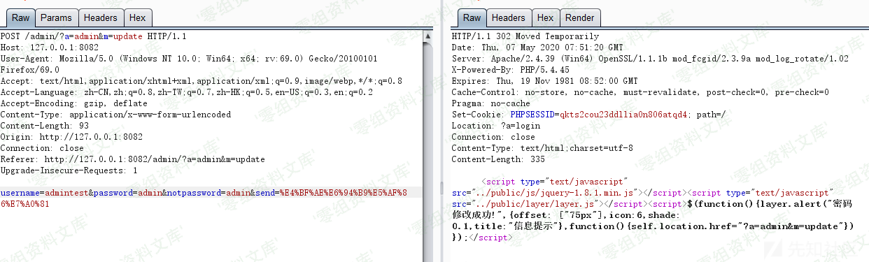 这一系列的操作主要是用来生成SQL语句然后执行SQL语句,editAdmin函数直接把传进来的username password拼接到sql语句中,然后去更新相关表中id=1的数据,这也就造成了任意更改管理员账号密码