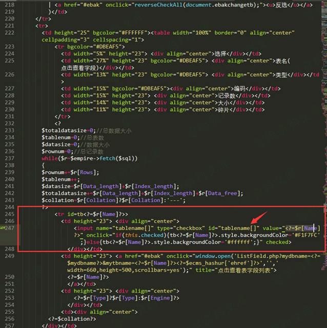 漏洞代码发生在后台数据备份处代码/e/admin/ebak/ChangeTable.php 44行附近,通过审计发现执行备份时,对表名的处理程序是value=”” 通过php短标签形式直接赋值给tablename[]。