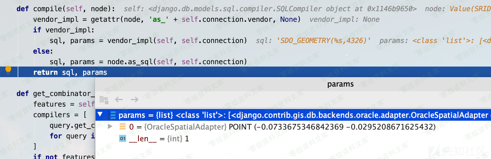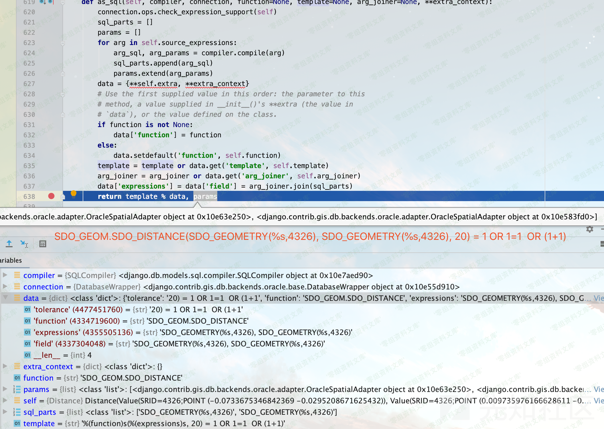 tolerance 从self.extra.get导入,该方法会搜索全局变量的值,如果该值不存在,则直接设置为0.05,并且将其直接传入到新的变量中。之后则不对tol进行任何处理直接拼接到template字符串中并且传入as_sql方法。那么官方对于as_sql的文档是,此方法需要一个SQLCompiler对象,位于django/db/models/sql/compiler.py文件中。而我们只需要知道在该对象中有一个compile()方法,该方法可以返回一个包含SQL字符串的元祖,而SQLComiler对象中的query变量则是存储直接进行SQL查询语句的SQL命令。从而两个Point分别进入compile方法中进行拼接