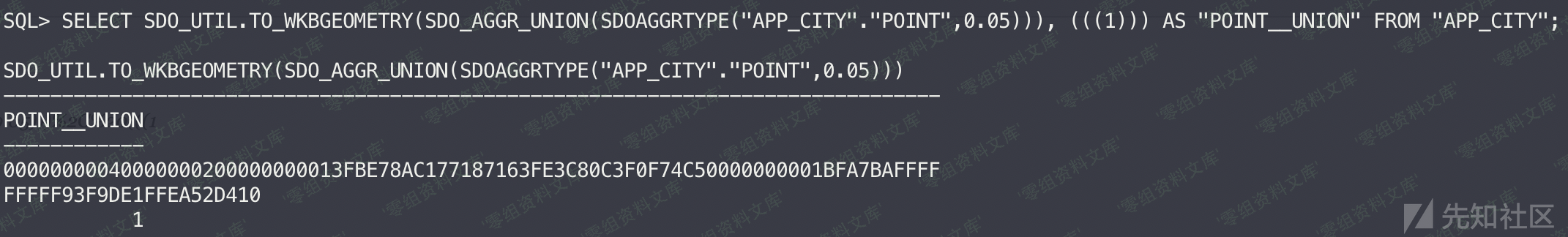 SELECT SDO_UTIL.TO_WKBGEOMETRY(SDO_AGGR_UNION(SDOAGGRTYPE(“APP_CITY”.”POINT”,0.05))), (((1))) AS “POINT__UNION” FROM “APP_CITY”;