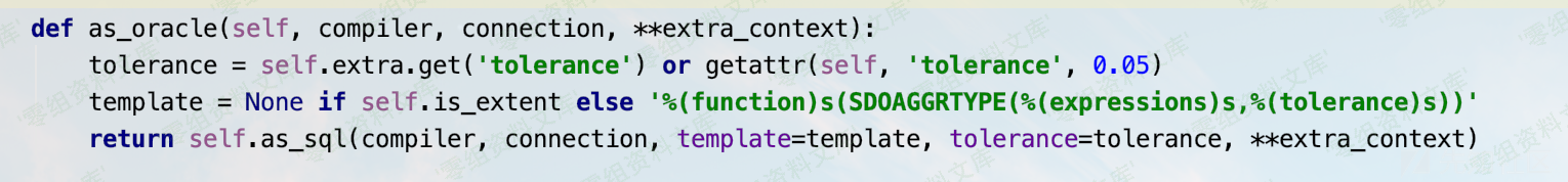 该aggregate查询方法是GIS查询特定的一种查询方法,为的是与地理查询的语句做适配,用法跟原模块的方法类似。因此跟进GIS模块中的聚合查询方法,位于django/contrib/gis/db/models/aggregates.py文件内的as_oracle方法。