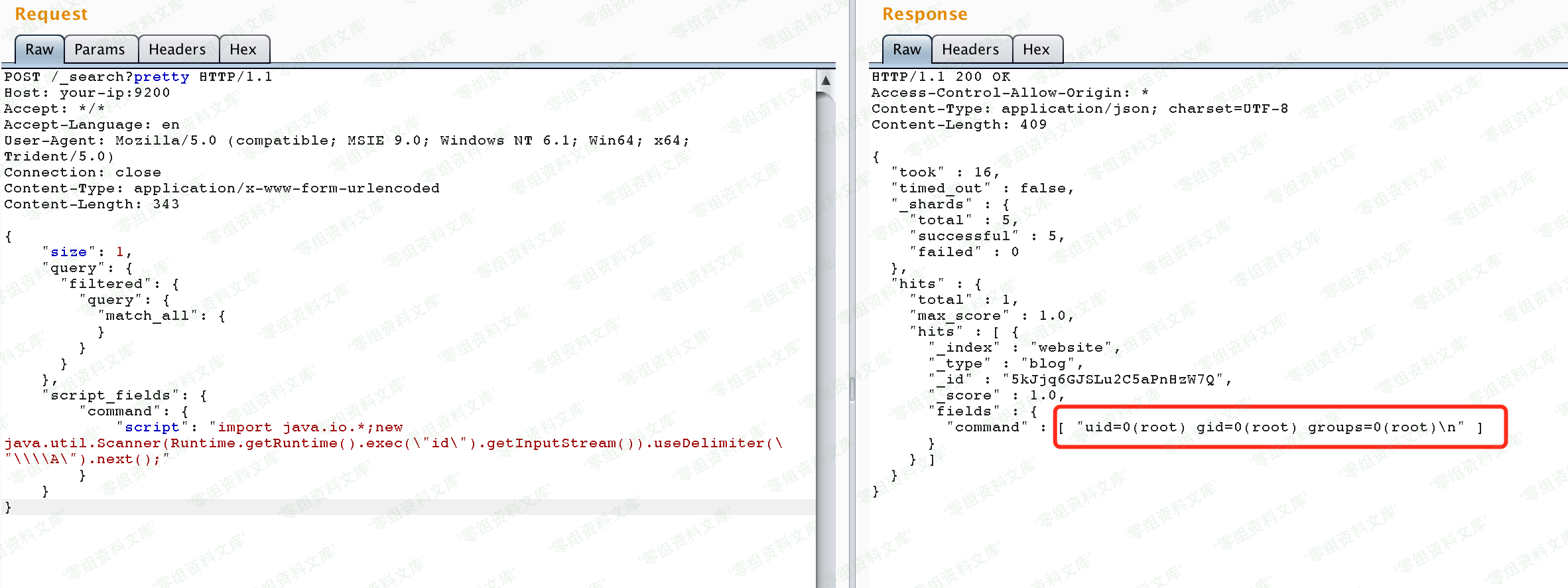 老版本ElasticSearch支持传入动态脚本(MVEL)来执行一些复杂的操作,而MVEL可执行Java代码,而且没有沙盒,所以我们可以直接执行任意代码。