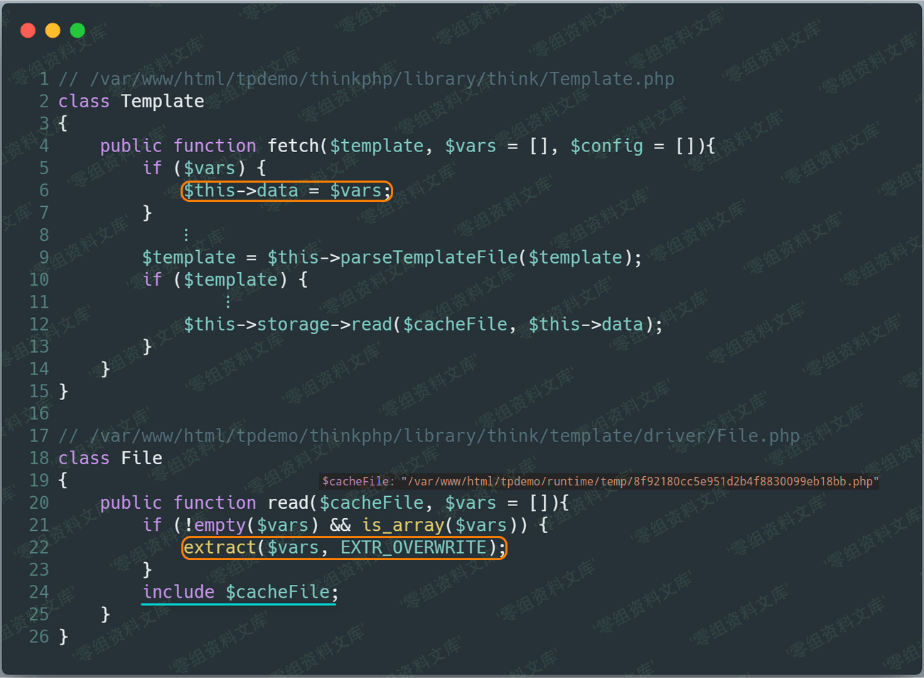 官方的修复方法是:先将 $cacheFile 变量存储在 $this->cacheFile 中,在使用 extract 函数后,最终 include 的变量是 $this->cacheFile ,这样也就避免了 include 被覆盖后的变量值。