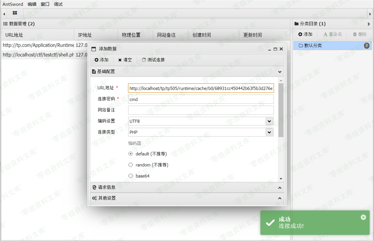 之后访问蚁剑 `http://url/runtime/cache/b0/68931cc450442b63f5b3d276ea4297.php`