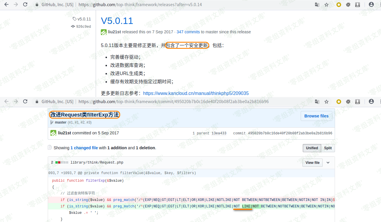 首先在官方发布的 5.0.11 版本更新说明中,发现其中提到该版本包含了一个安全更新,我们可以查阅其 commit 记录,发现其修改的 Request.php 文件代码比较可疑。