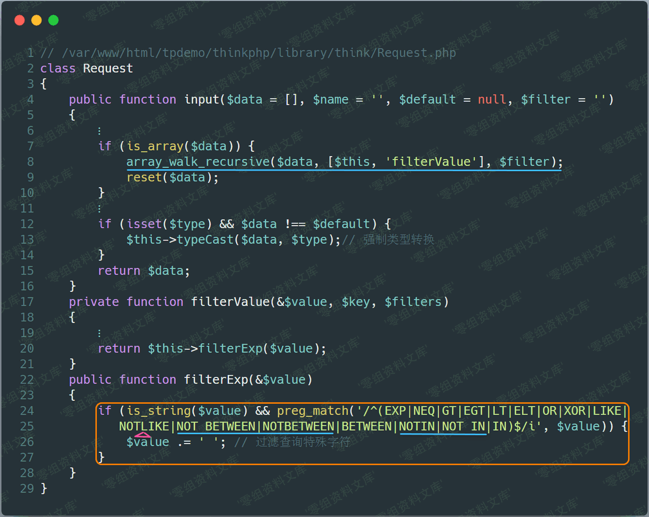 接着我们直接跟着上面的攻击 payload 来看看漏洞原理。首先,不管以哪种方式传递数据给服务器,这些数据在 ThinkPHP 中都会经过 Request 类的 input 方法。数据不仅会被强制类型转换,还都会经过 filterValue 方法的处理。该方法是用来过滤表单中的表达式,但是我们仔细看其代码,会发现少过滤了 NOT LIKE ,而本次漏洞正是利用了这一点。