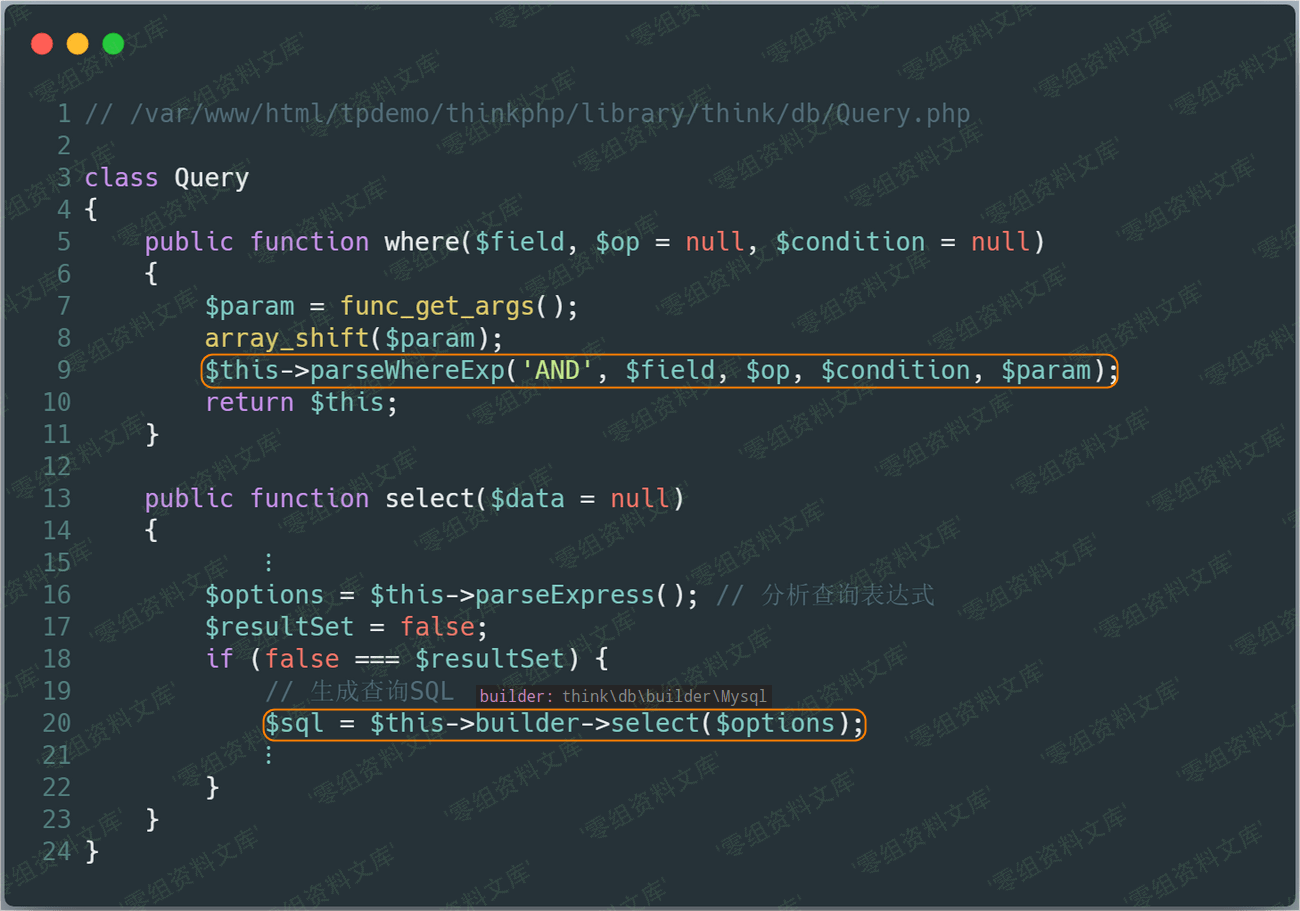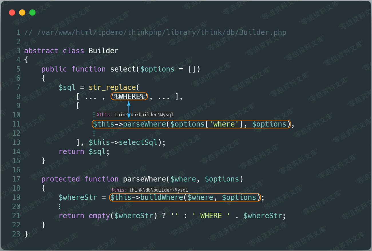 上面的 $this->builder 为 \think\db\builder\Mysql 类,该类继承于 Builder 类,所以接着会调用 Builder 类的 select 方法。在 select 方法中,程序会对 SQL 语句模板用变量填充,其中用来填充 %WHERE% 的变量中存在用户输入的数据。我们跟进这个 where 分析函数,会发现其会调用生成查询条件 SQL 语句的 buildWhere 函数。