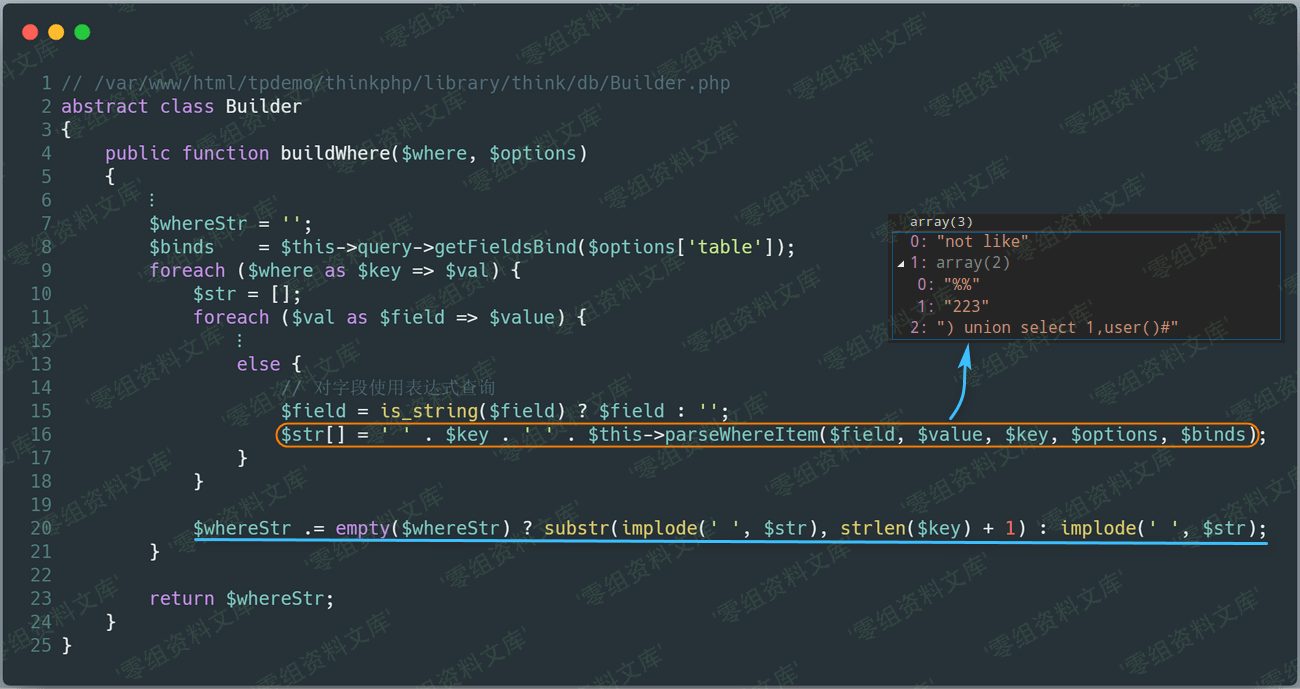 继续跟进 buildWhere 函数,发现用户可控数据又被传入了 parseWhereItem where子单元分析函数,该函数的返回结果存储在 $str 变量中,并被拼接进 SQL 语句。(下图 第16、20行)
