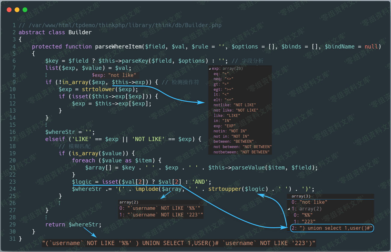 我们跟进 parseWhereItem 方法,发现当操作符等于 NOT LIKE 时,程序所使用的 MYSQL 逻辑操作符竟然可由用户传来的变量控制(下图 第23行 ),这样也就直接导致了 SQL注入漏洞 的发生。