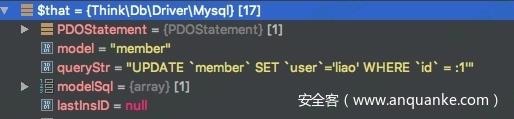 这里由于拼接了$val参数的形式造成了注入,但是这里的bind表达式会引入:符号参数绑定的形式去拼接数据,通过白盒对几处CURD操作函数进行分析定位到update函数,insert函数会造成sql注入,于是回到上面的updateh函数。