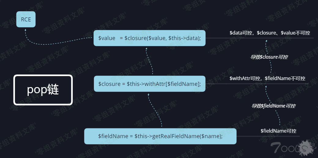 这里$fieldName、$this->withAttr,导致$closure也可控,最终直接产生RCE。如下图