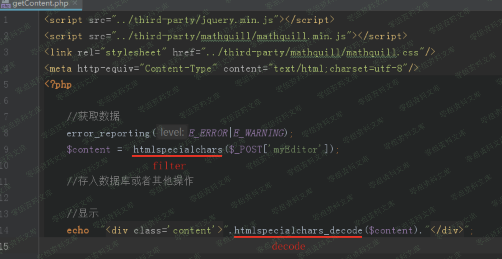 入进行了过滤,但是在14行输出时却使用了htmlspecialchars_decode,造成XSS漏洞。