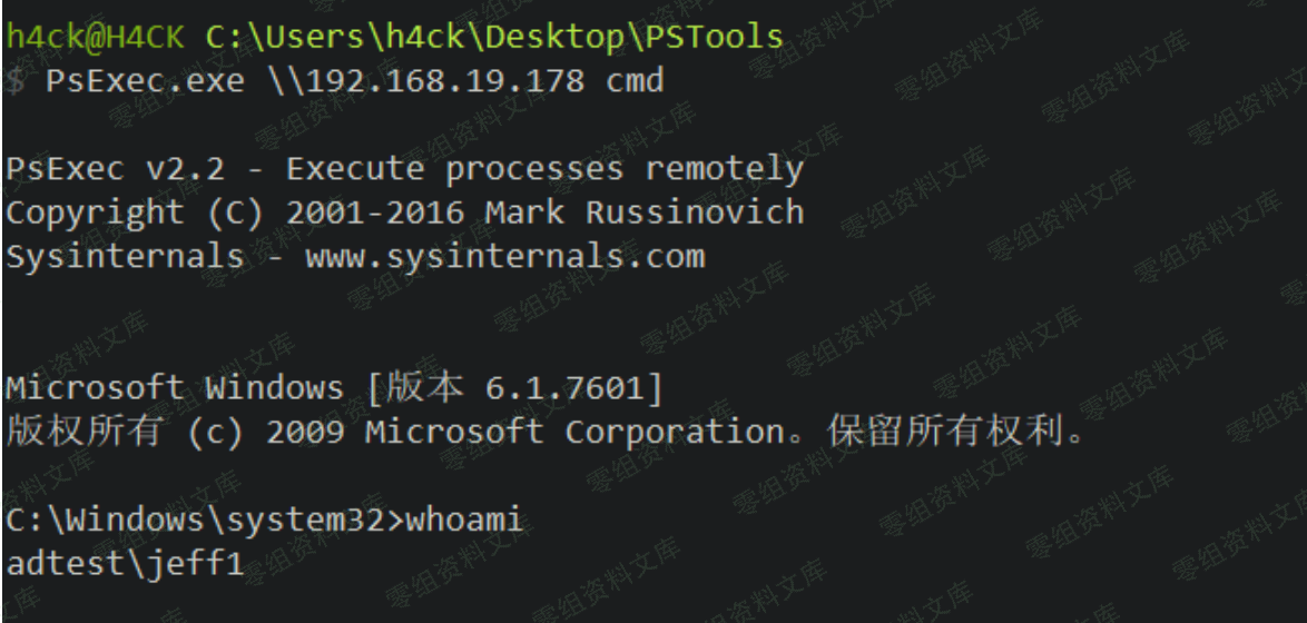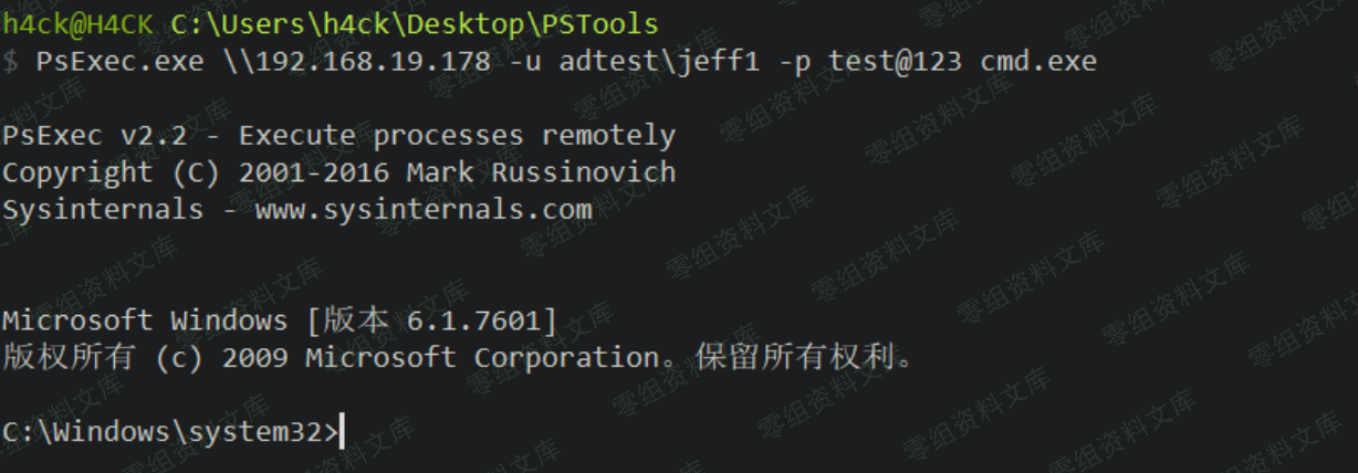 PsExec.exe \\192.168.19.178 -u adtest\jeff1 -p test@123 cmd.exe