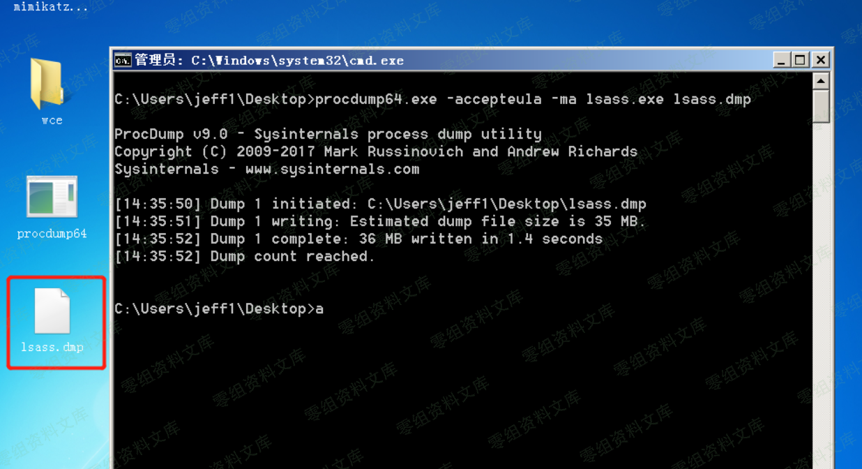 #### 1、使用 procdump 将目标的 lsass.exe 转储成 dmp 文件