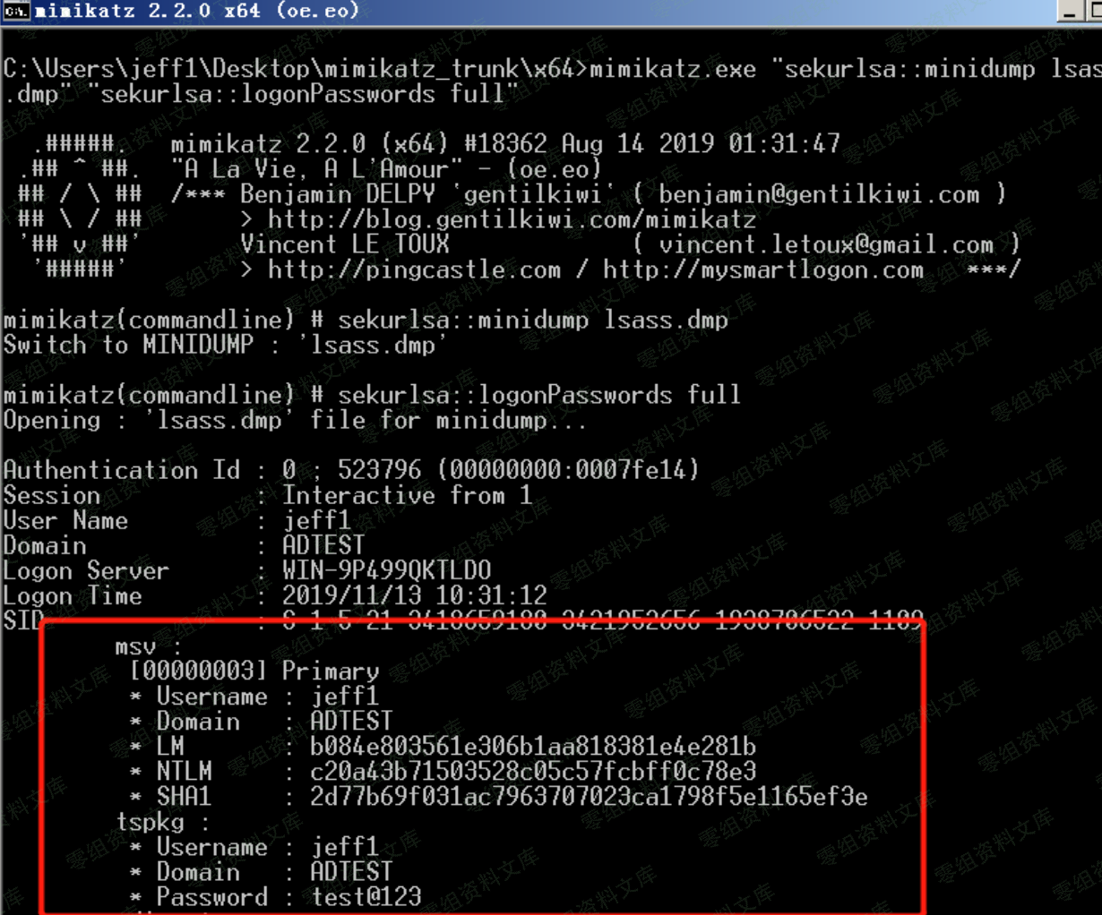 #### 2、使用 mimikatz 从转储的 lsass.dmp 中来读取明文密码