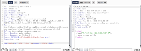 来到前台漏洞点,`http://mkcms.com/ucenter/reg.php`(`mkcms.com为本地静态`!)