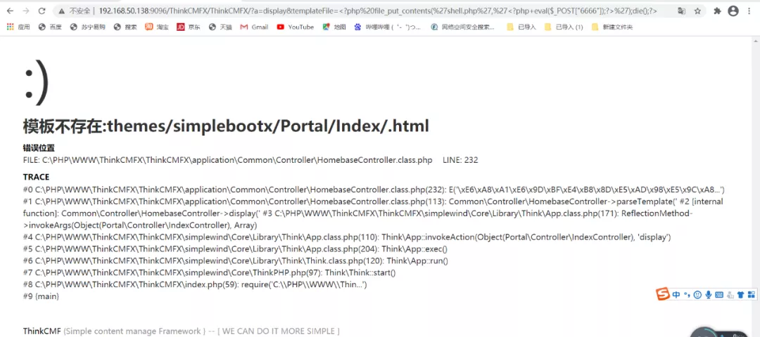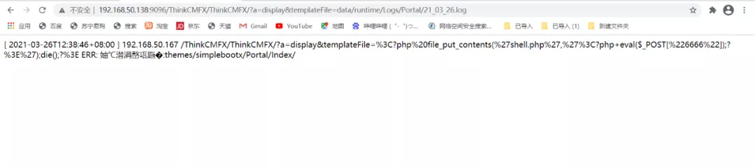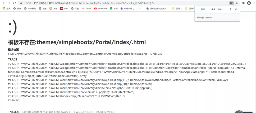 由于thinkcmf2.x使用了thinkphp3.x作为开发框架,默认情况下启用了报错日志并且开启了模板缓存,导致可以使用加载一个不存在的模板来将生成一句话的PHP代码写入data/runtime/Logs/Portal目录下的日志文件中,再次包含该日志文件即可在网站根目录下生成一句话木马m.php