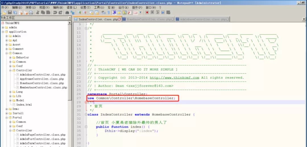 在项目路径下找到入口分组的控制器类选择IndexController 控制器类打开,可以知道继承了HomebaseController,通过gma参数指定分组模块方法,这里可以通过a参数直接调用PortalIndexController父类(HomebaseController)中的一些权限为public的方法