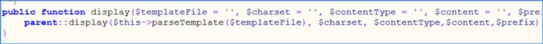 display函数 (**可以自定义加载模版,通过$this->parseTemplate 函数根据约定确定模版路径,如果不符合原先的约定将会从当前目录开始匹配**) 的作用是加载模板和页面输出,所对应的参数为:templateFile为模板文件地址,charset模板字符集,contentType输出类型,content输出内容