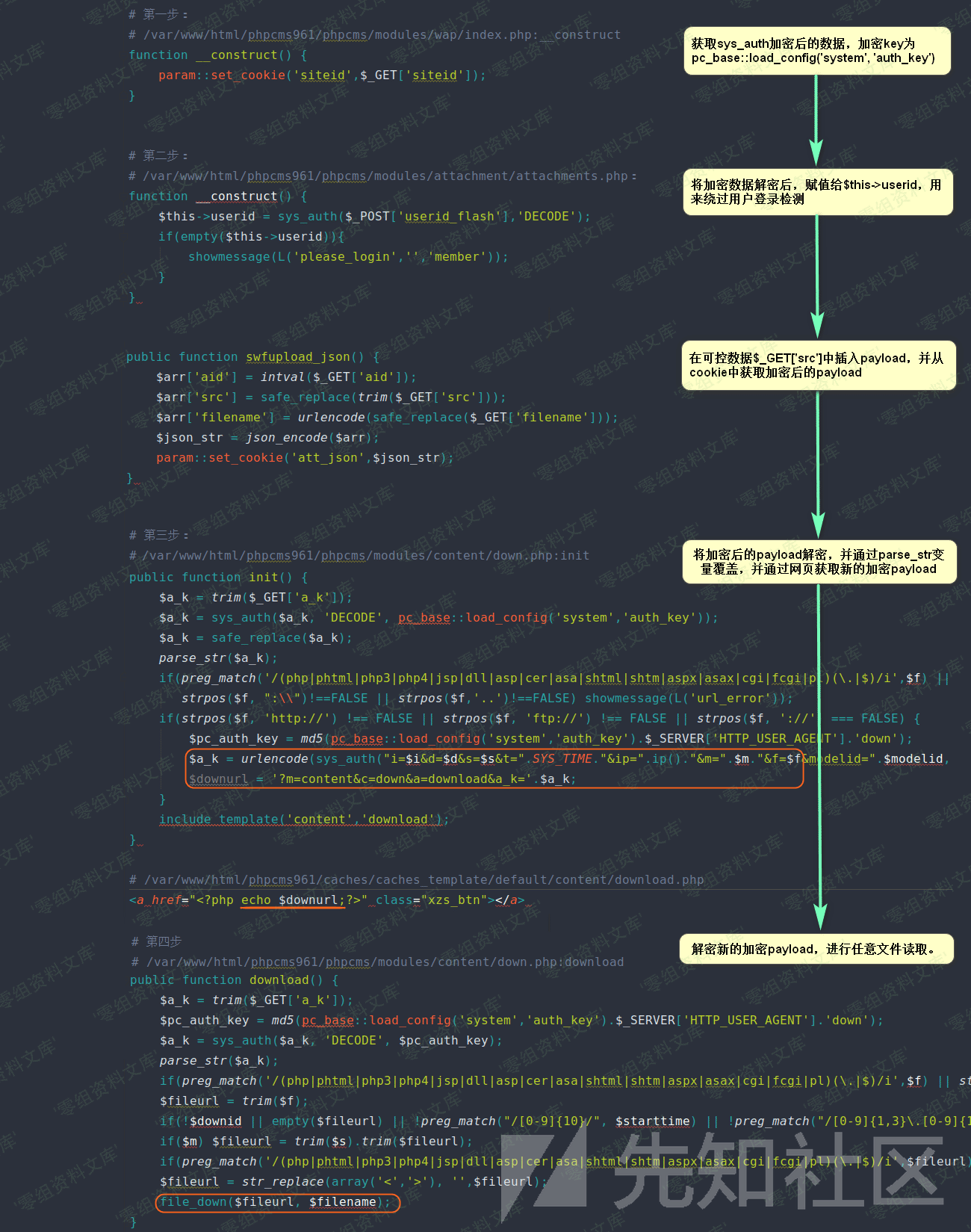 漏洞攻击链的前2步是一样的,这里不再赘述。(下图对应文件位置:phpcms/modules/content/down.php)