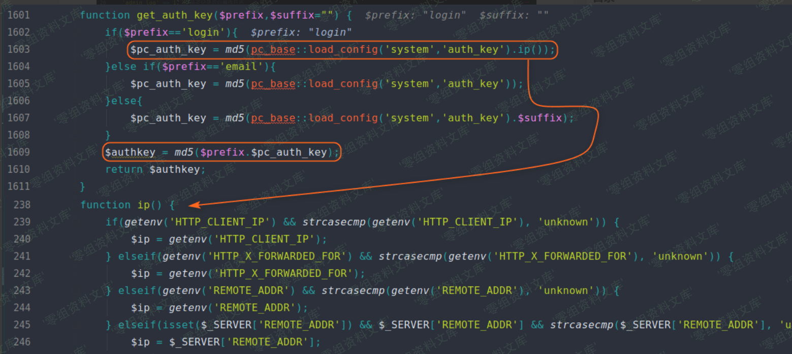 再通俗些的话:sys\_auth方法对cookie中包含auth的参数名对应的密文值,先使用配置文件中的auth\_key进行sys\_auth得到的值作为第一次解密后的值,然后使用配置文件中的auth\_key的值与客户端请求的IP拼接做MD5加密的值做为新的key,第一次解密后的值与新的key最后传入sys\_auth进行解密得到最终的明文。