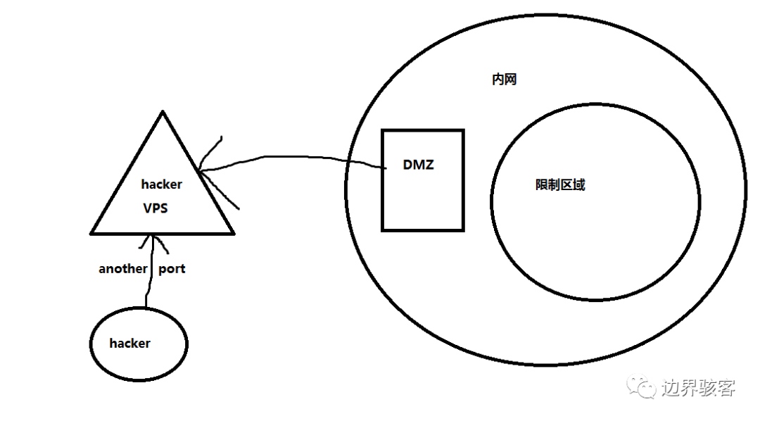**正向代理:**已控服务器开个端口,我们通过这个端口从而形成一个正向的隧道。但是入口一般处于DMZ区域一般都有防火墙,新开的端口普遍我们访问不到。