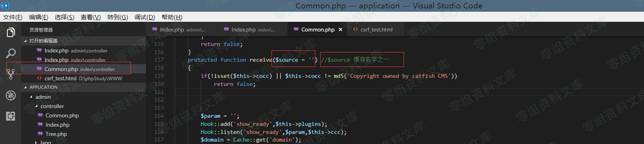 然后是ndex目录里面的Common模块里面的receive 方法获取了变量\$source 值 = index获取了变量\$page 值 = 1