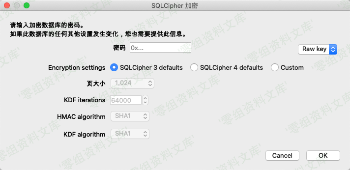 > 选择SQLCipher 3 defaults 密码类型选择为raw key 在密码框输入0x后再输入之前的密钥共64位进行解密